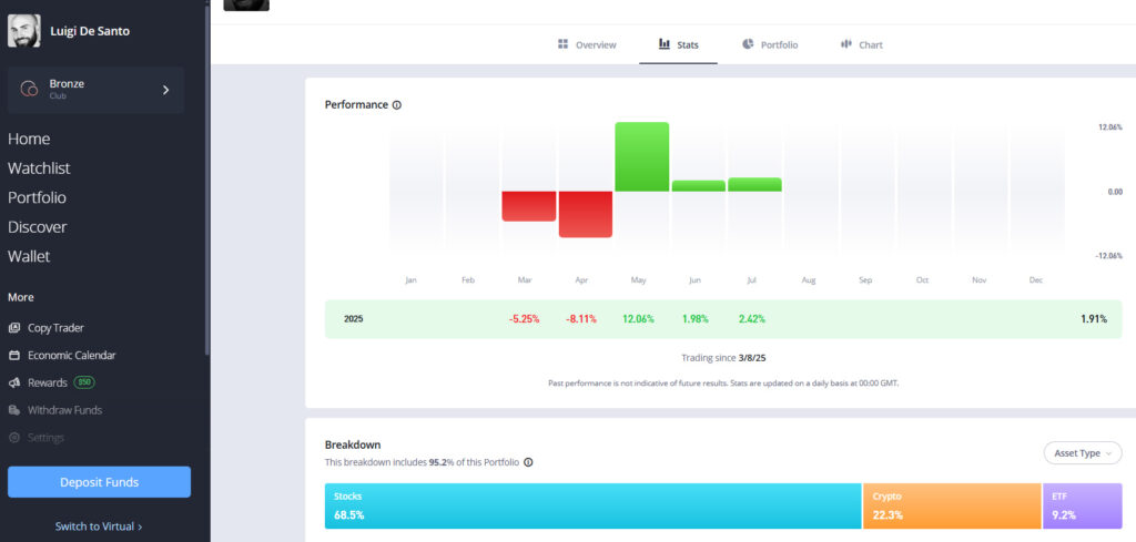 Per rendere più concreto ciò di cui parlo su ComeInvesto.com: non sono solo teorie, qui mostro cosa faccio davvero. Se ti interessa vedere l’evoluzione dei miei investimenti mese dopo mese, continua a seguirmi su etoro.
