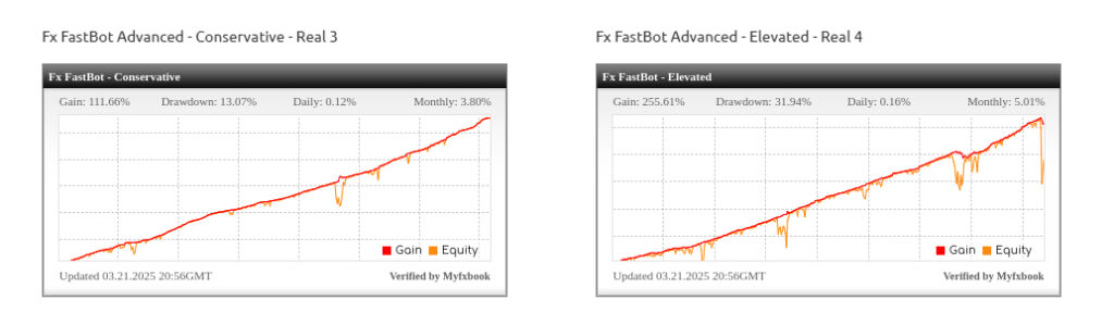 Secondo i dati forniti dal sito ufficiale, FX FastBot Advanced ha registrato un guadagno totale del 219,57% su un periodo di 627 giorni, con una crescita mensile media del 5,75% e un drawdown massimo del 12,05%. Questi risultati indicano una performance costante e una gestione efficace del rischio.